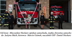 Dusza się radowała, ręce składały się do oklasków, bo wszystko było zgodne z ceremoniałem strażackim. Uroczystość nie tylko podniosła, ale bardzo ważna dla miejscowej OSP, jak też dla naszego powiatu. W jubileuszowym roku powstania straży w tej miejscowości została ona powołana do Krajowego Systemu Ratowniczo Gaśniczego. Zamieszczone poniżej zdjęcie obrazuje tylko jedną z ważnych części uroczystości, tj. przygotowanie do poświęcenia i przekazania bojowego samochodu strażackiego oraz odsłonięcia rzeźby św. Floriana – patrona strażaków. Wcześniej sztandar jednostki został odznaczony Złotym Znakiem Związku – najwyższym odznaczeniem strażackim, a liczna grupa miejscowych strażaków została wyróżniona medalami „Za Zasługi dla Pożarnictwa” i „Wzorowy Strażak”.